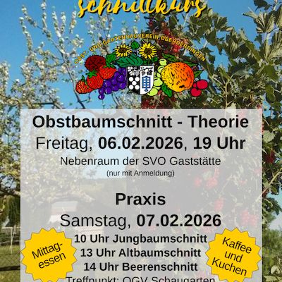Wir werden dieses Jahr unseren Obstbaumschnittkurs erneut in Theorie und Praxis aufteilen. Hierfür findet am Freitag, den 6. Februar 2026 um 19 Uhr die Einführung in die Theorie des Obstbaumschnitts (für Jung- und Altbaum) im Nebenraum der SVO Gaststätte, Am Stadion 2 statt. Wir bitten hierfür um ...