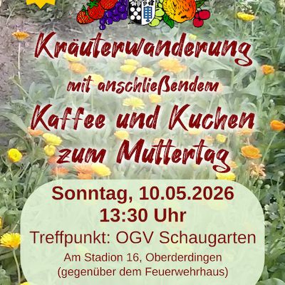 Auch dieses Jahr lädt der Obst- und Gartenbauverein Oberderdingen am Muttertag, den 10.5.2026, wieder zu einer Kräuterwanderung ein. Dieses mal konnten wir die Wildkräuterpädagogin Vanessa Titz als Referentin gewinnen. Die Kräuterwanderung wird um 13:30 am OGV Schaugarten, Am Stadion 16 in ...