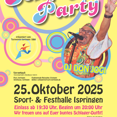 Bald ist es soweit! Die Schlagerparty beim Turnverein Ispringen steht in den Startlöchern. Erlebt mit uns gemeinsam am 25. Oktober die heißeste und bunteste Schlager-Nacht des Jahres in der Sport- und Festhalle Ispringen.