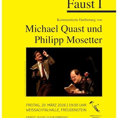 Goethes Faust I als brillante, urkomische Bühnenkunst. Der bekannte Schauspieler Michael Quast als ewig strebender Faust und Philipp Mosetter als „geistvolle Fußnote“ sind in einer außergewöhnlichen Inszenierung voller Witz und Scharfsinn zu sehen. Die FAZ urteilte: „Ein Abend, an dem auch ...